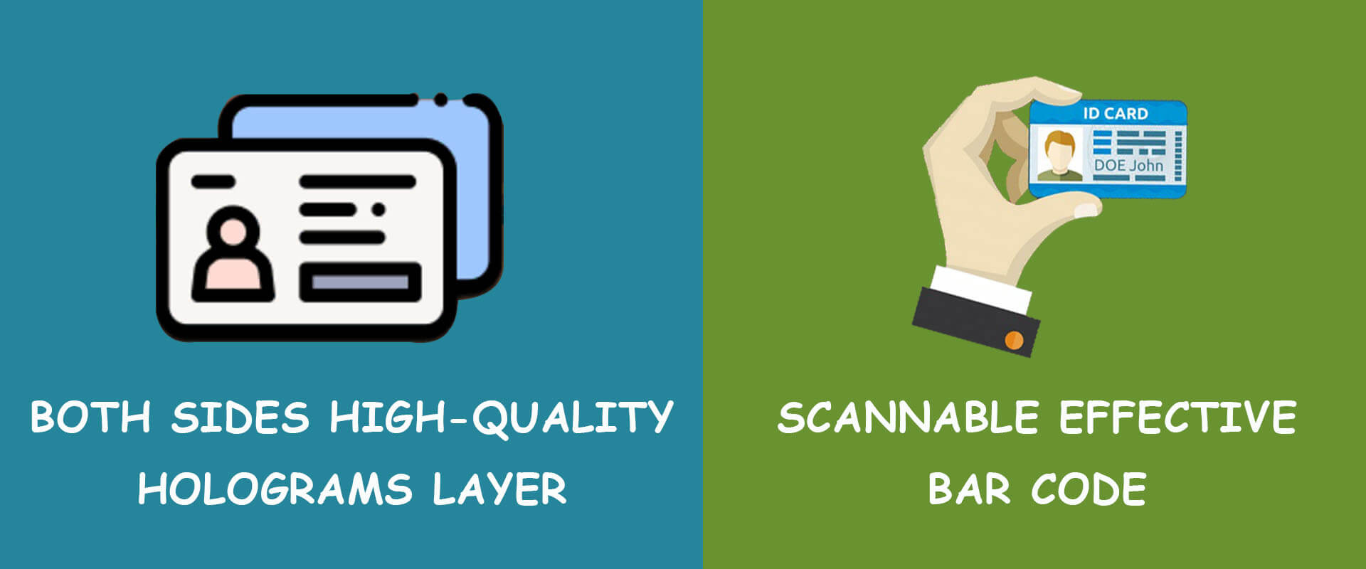All ID card are featuring both side holograms and scannable barcodes. Add any number of security features, and be assured of a pass on backlight tests, working holograms, scannable barcodes, and many more.